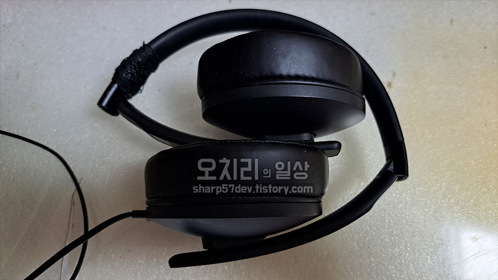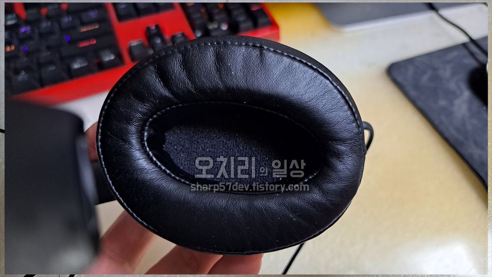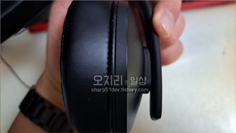 귀 쿠션 부분입니다. 쿠션 느낌은 나쁘지 않았지만 제 귀를 모두 덮기에는 조금 작은 사이즈였습니다. 헤드폰을 쓰고 쿠션 위치를 조정하지 않으면 귀가 쿠션 안으로 다 들어가지가 않아서 불편함이 있었습니다. 생각보다 작은 사이즈라 당황하긴 했으나 가격대비 가성비를 생각하면 그냥 그러려니하고 사용하기로 하였습니다.