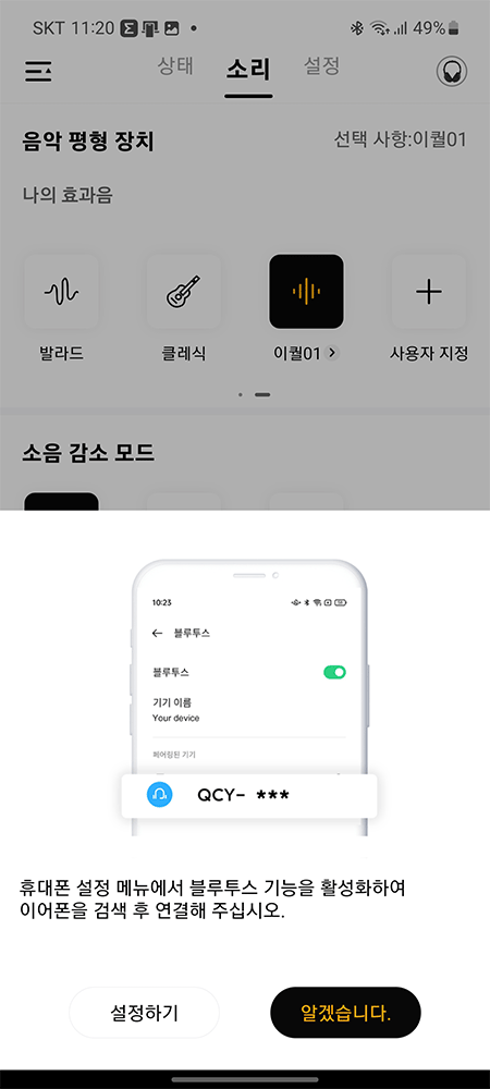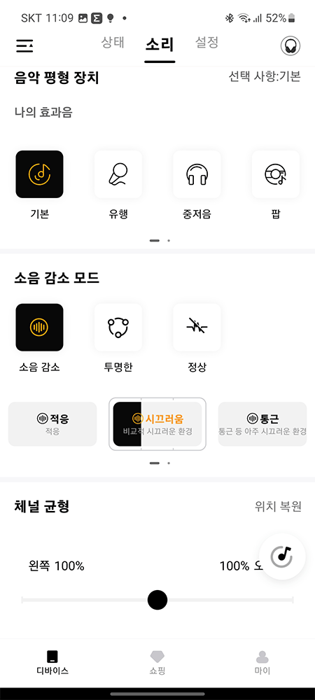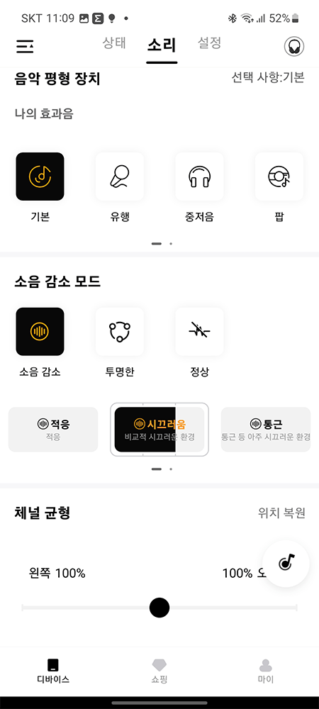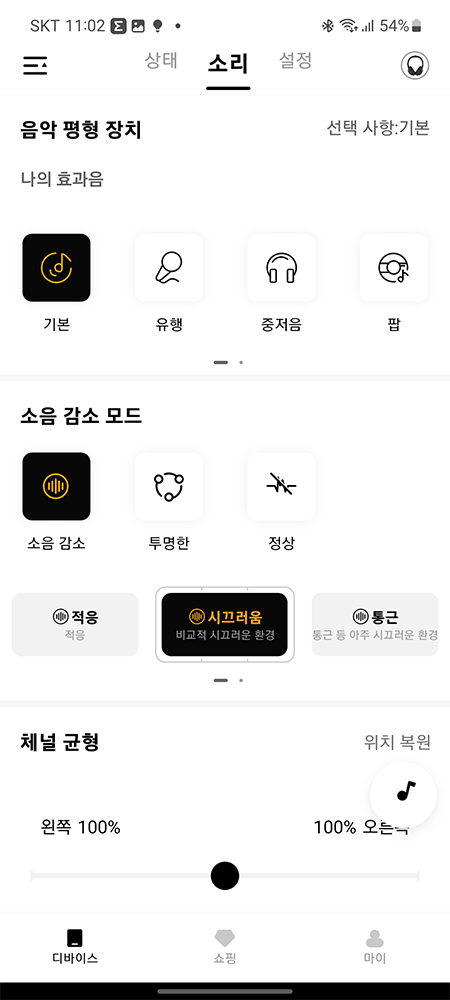 설치가 끝난 후 '음악 평형 장치'와 '소음 감소 모드', '채널 균형'을 설정할 수 있습니다.