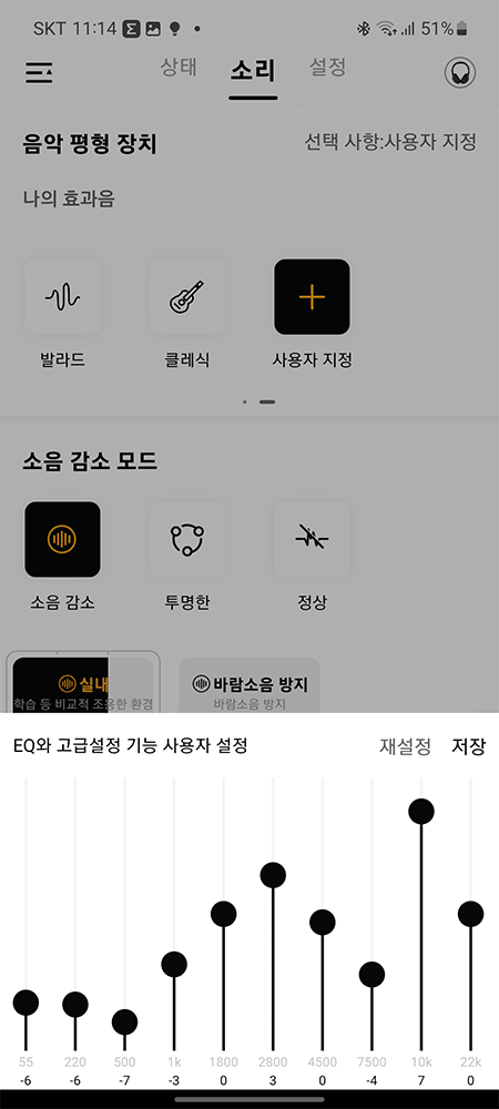 세팅되어 있는 이퀄라이저도 사용자 지정으로 원하는 이퀄라이저로 설정하여 저장할 수 있습니다.