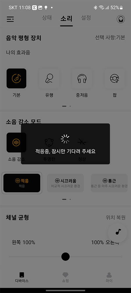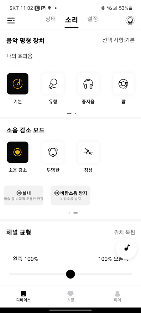 노이즈 캔슬링을 설정으로 '적용/시끄러움/통근'등으로 선택하고 세기도 조절할 수 있습니다.