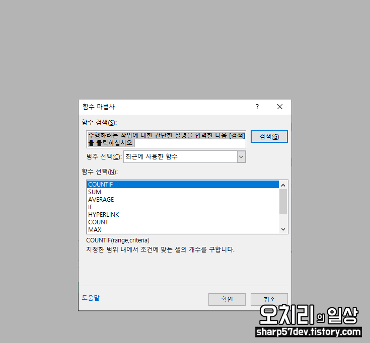 함수 'COUNTIF'를 검색하여 선택학고 확인버튼을 클릭합니다.