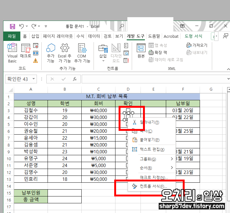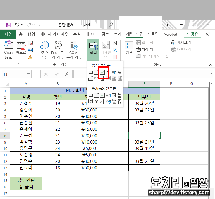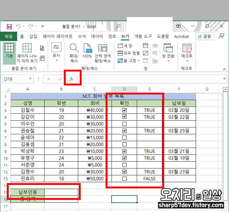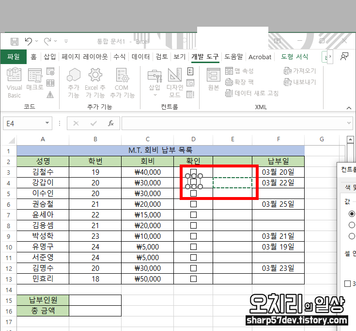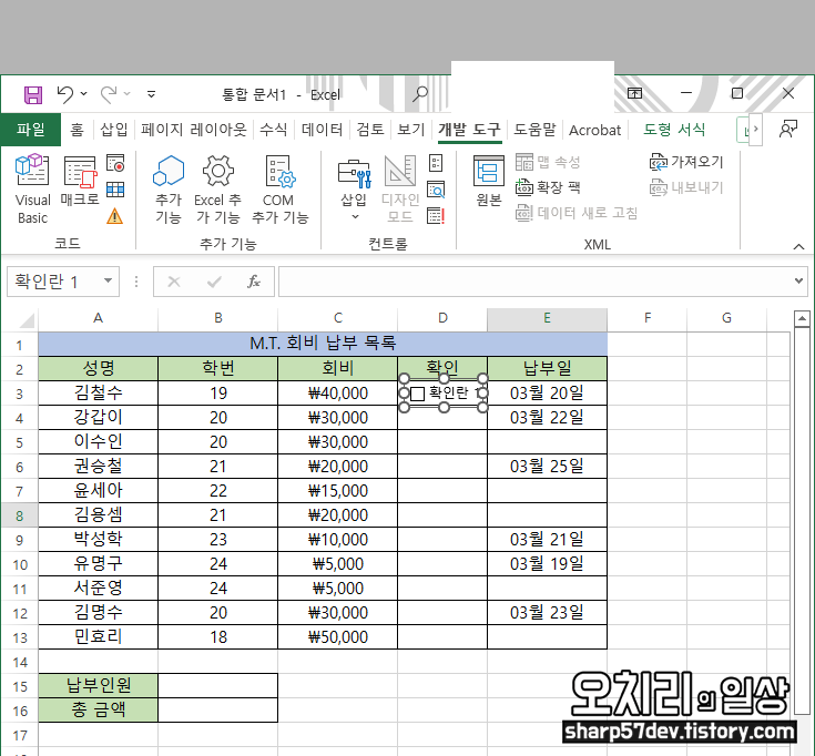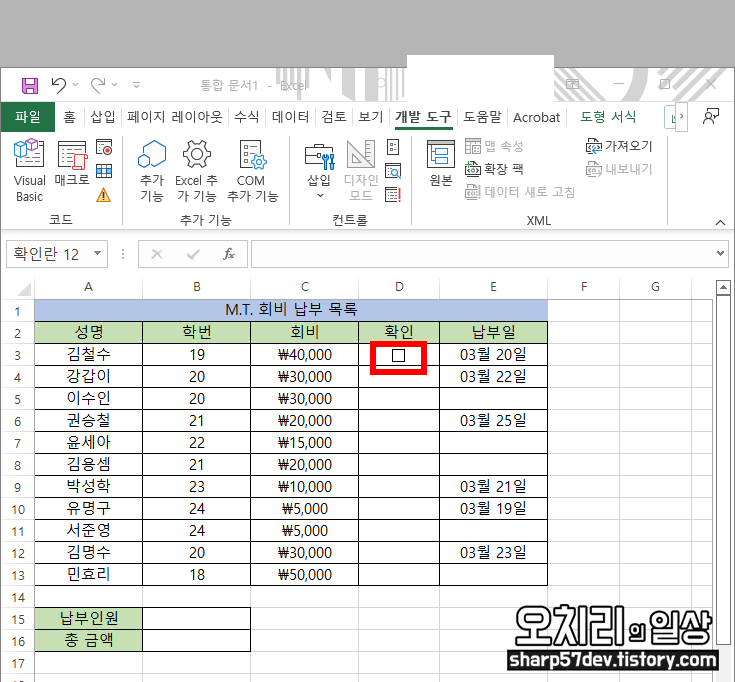 회비 납부 목록에서 비워놨던 '확인'란에 체크 도구를 옮겨 놓습니다.