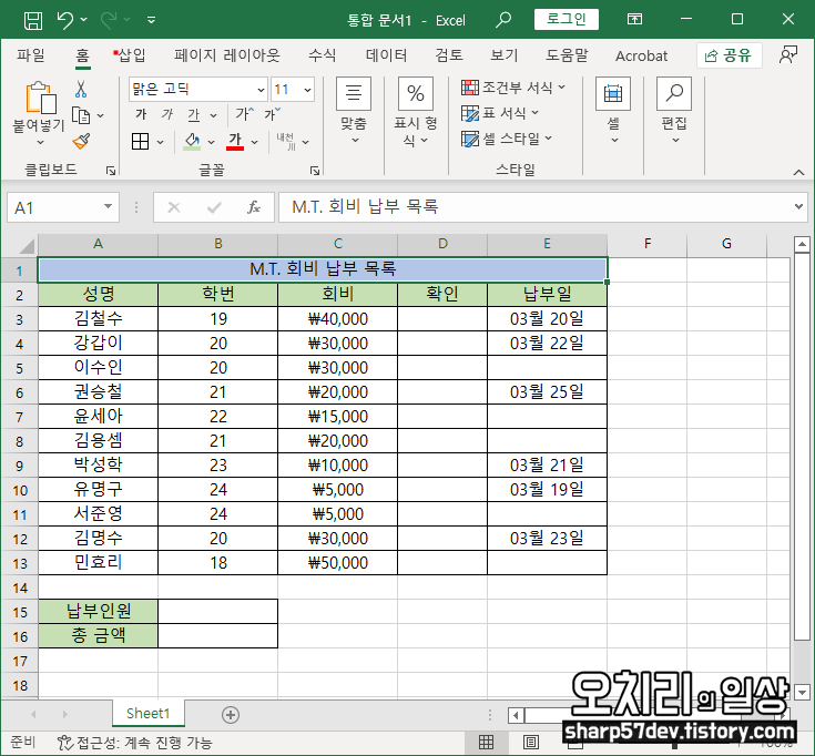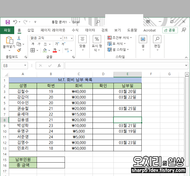 다음 예제는 M.T. 회비 납부 목록입니다. 각 학번별로 회비가 다르고, 회비를 낸 학생은 납부일을 기입하고 그 결과로 '납부 인원과 걷힌 회비 총 금액'을 계산하여 정산하는 표를 만들어 보았습니다.