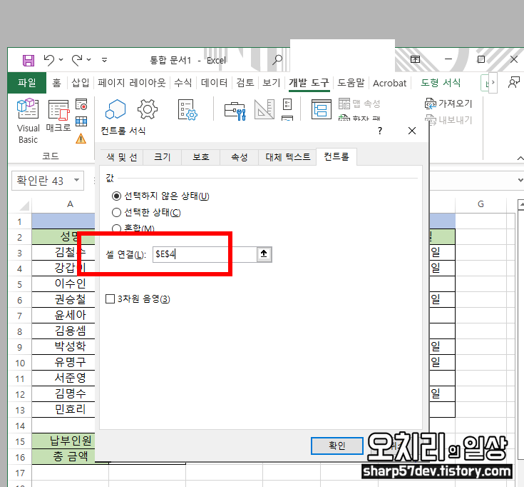 나머지 '확인'란에도 '체크박스'를 넣고 '컨트롤 서식'메뉴를 클릭하여 아까 위와 같이 'D'열의 옆셀을 입력합니다.