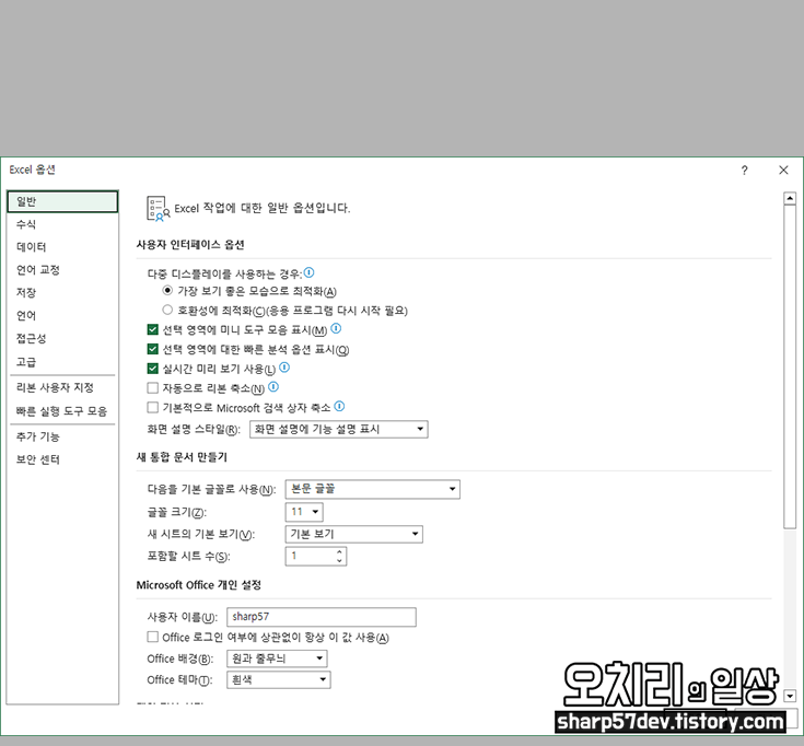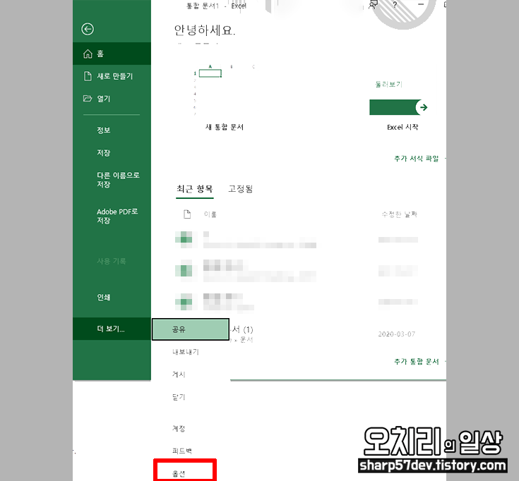 엑셀(excel) 옵션창으로 들어갑니다.