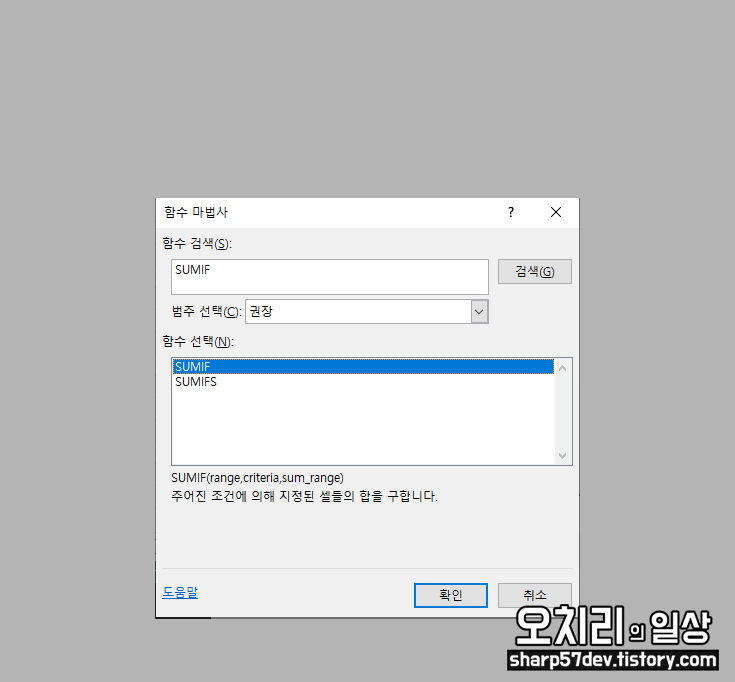 'SUMIF'함수를 검색하고 선택하여 확인버튼을 클릭합니다.