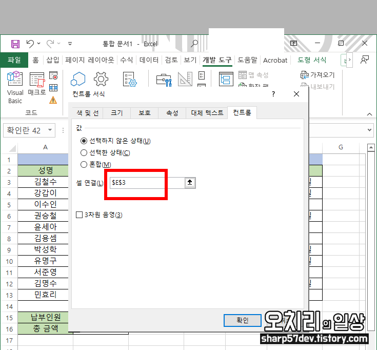 '컨트롤 서식'메뉴창이 뜹니다. '컨트롤'탭으로 이동하고 '셀 연결'에 체크 도구를 만들었던 '$D$3'의 오른쪽 셀인 '$E$3'을 입력하여 셀을 연결하게 합니다.