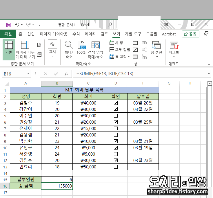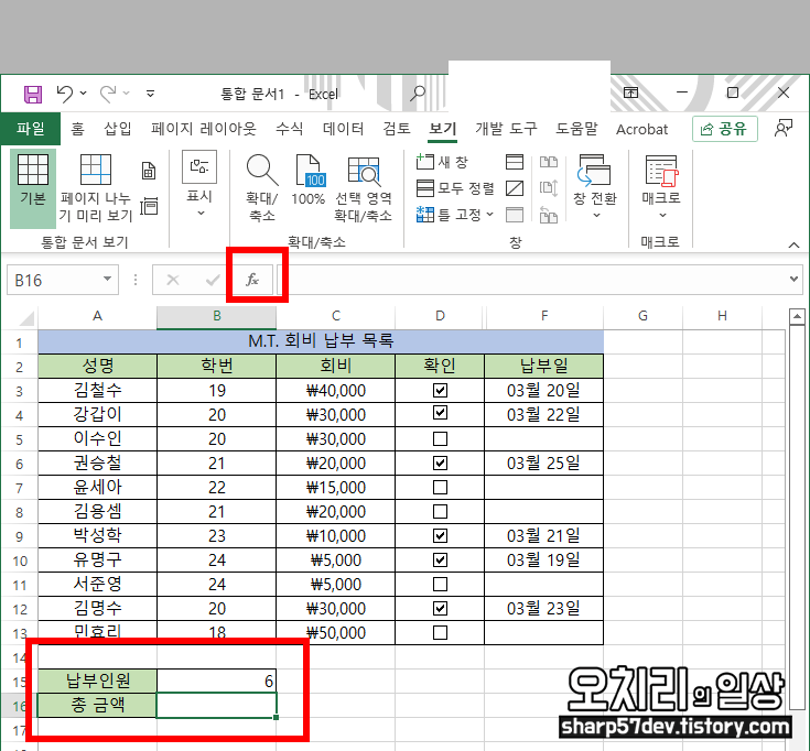 그럼 이제 이 체크현황에 따라 '납부인원'에 회비를 납부한자가 몇 명인지 출력해 보도록 하겠습니다.