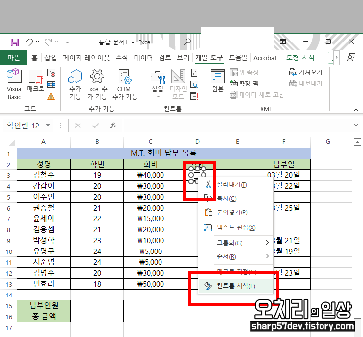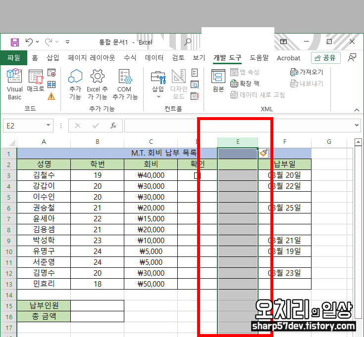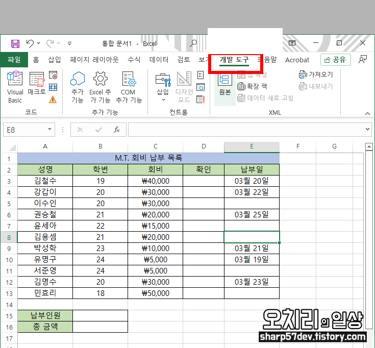 이제 아까 생성해 놨던 회비 납부 목록으로 돌아옵니다. 위에 메뉴탭 중에서 '개발 도구'탭이 생성된 것을 확인할 수 있습니다.,