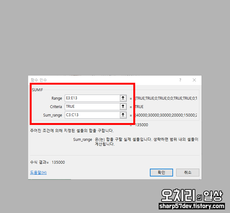Sum_range에는 'TRUE'값을 가진 열의 금액의 총합을 계산합니다.
