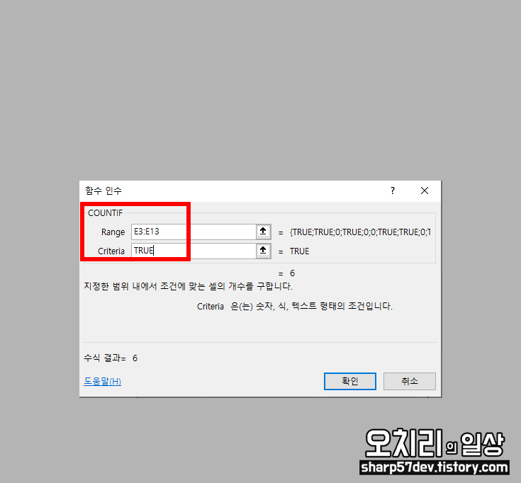 함수가 사용될 범위 'Range'과 함숫값 'Criteria'을 입력하여 체크박스에 체크된 'TRUE'와 같은 값의 수를 계산합니다.