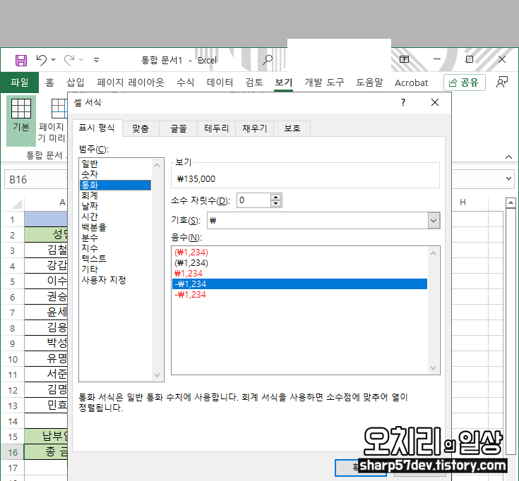 마우스 오른쪽 클릭으로 콘텍스트 메뉴를 선택하고 '셀 서식'을 선택하여 '표시 형식'에서 '통화'값을 클릭하고 확인버튼으로 나와 '총 금액'을 통화 형식으로 표시하도록 변경시켜 줍니다.