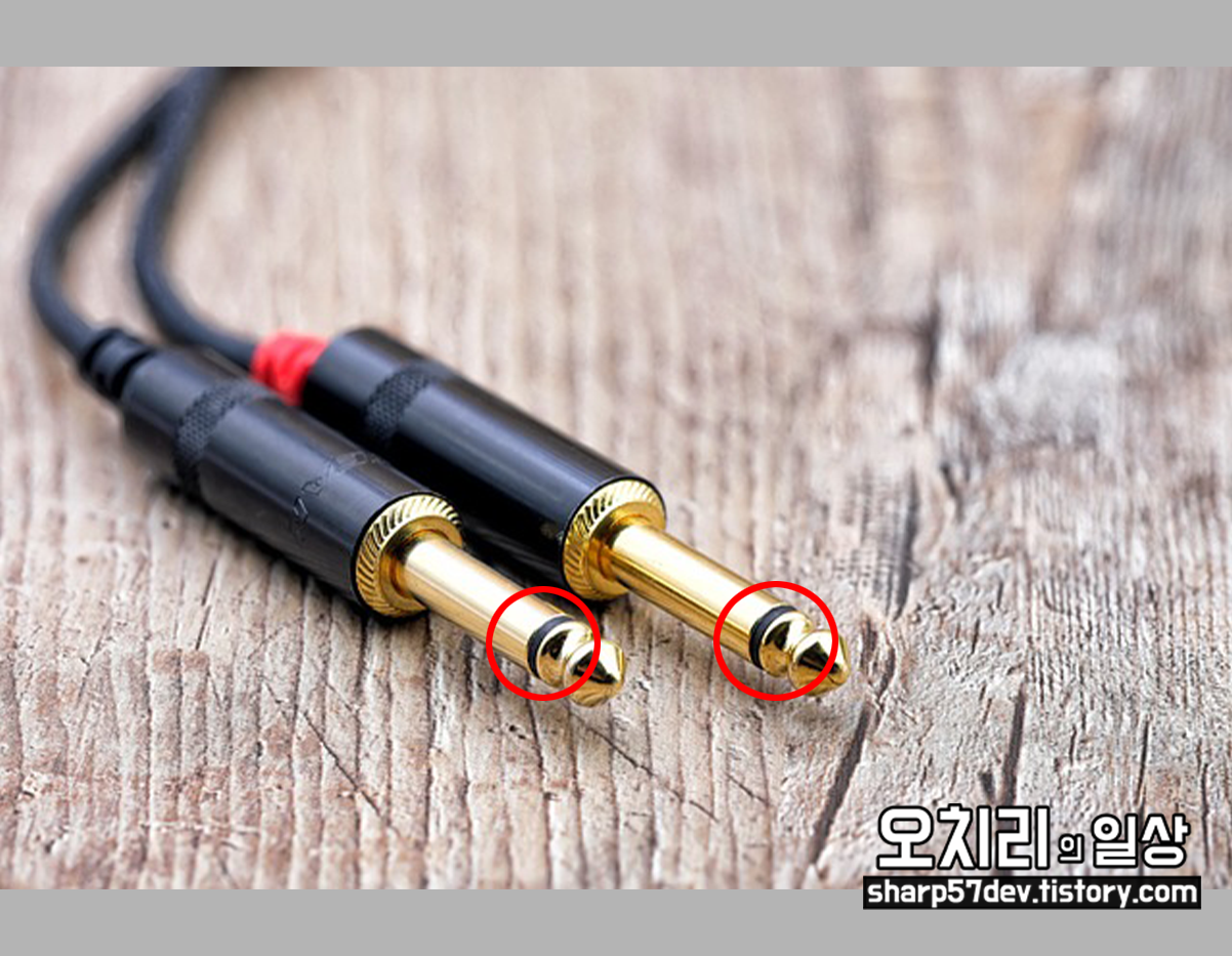 2극 단자는 마이크, 어쿠스틱 기타, 일렉기타 등 악기에 연결하여 많이 사용됩니다. 참고로 위 오디오 단자는 3.5mm가 아닌 3.5mm 단자보다 두꺼운 55 잭이라고도 불리는 오디오 케이블입니다.