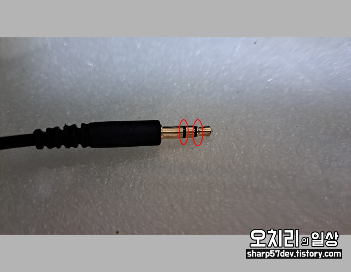 이 4극 단자는 좌, 우 스테레오 음향 출력과 마이크까지 입력할 수 있습니다. 얼마 전까지의 핸드폰 이어폰에 마이크까지 되었던 오디오 케이블이라 생각하시면 됩니다. 사진에도 마이크가 달려있는 것을 볼 수 있습니다.