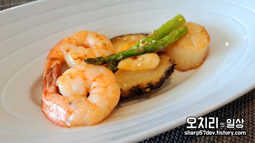 새우 두마리, 활 전복, 조개관자가 나왔습니다. 새우는 언제 먹어도 맛있네요. 활 전복도 상당히 커서 먹는 기분이 좋았습니다. 조개관자 같은 해물도 부드럽게 입에서 샤라라 녹더라고요.