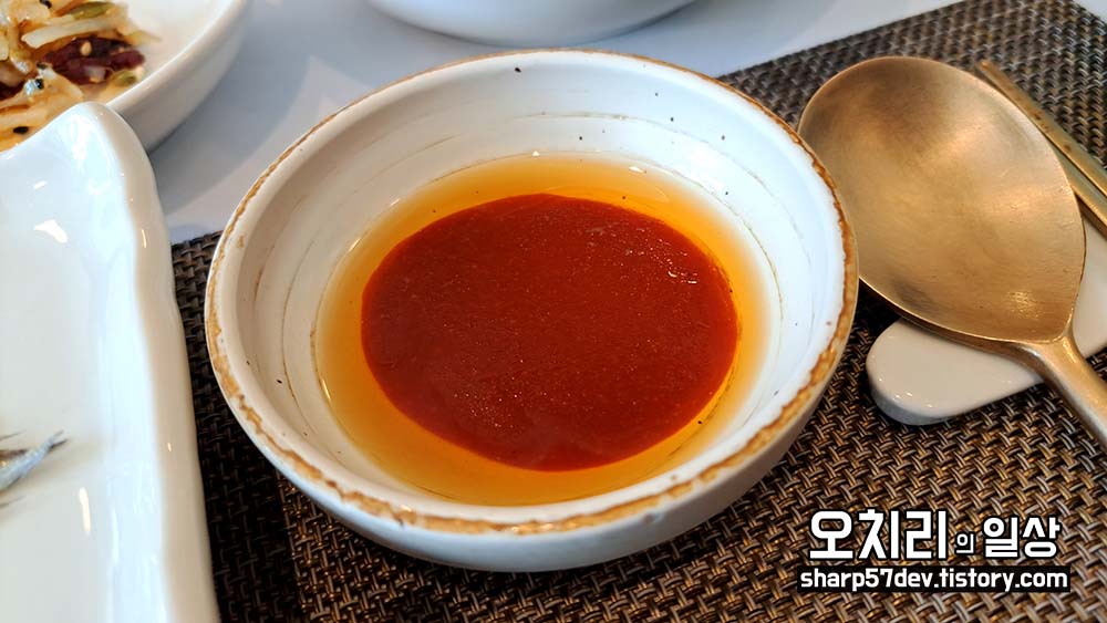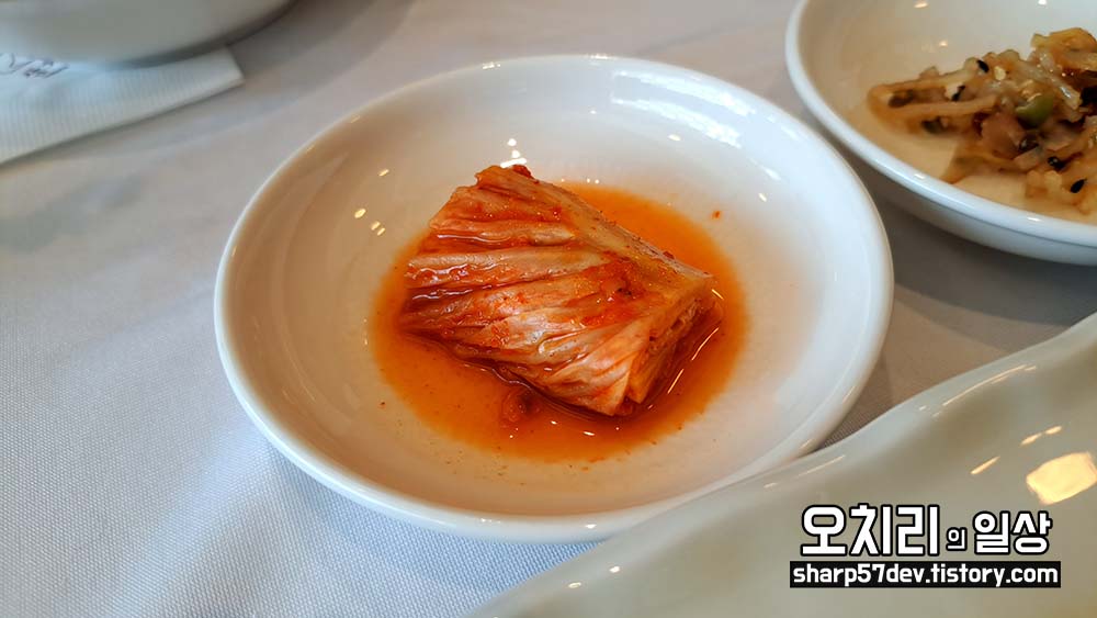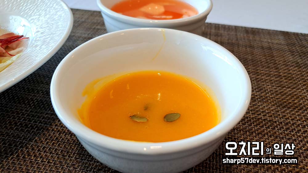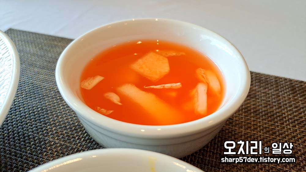호박죽과 침채(물김치)가 같이 나왔습니다. 호박죽은 따뜻하여 직원분께서 호박죽부터 먹는 것을 추천해 주셨습니다.