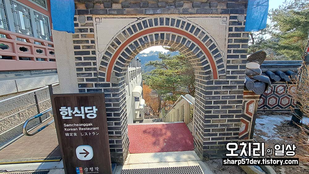 이제 일화당을 지나 바로 옆에 한식당으로 이어지는 계단이 있었습니다. 일화당으로 들어가면 엘리베이터가 있었다는데 처음 온 저는 그걸 몰랐습니다. 이 포스트를 보고 오시는 분들 중에 계단이 불편하신 분들은 옆에 엘리베이터가 있으니 엘리베이터를 이용하시면 되겠습니다.