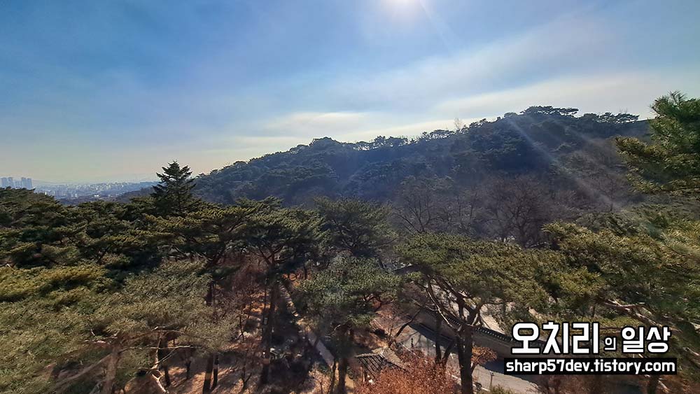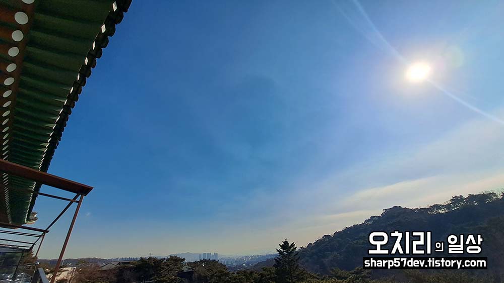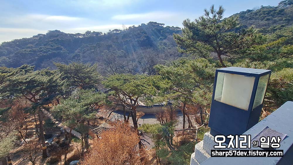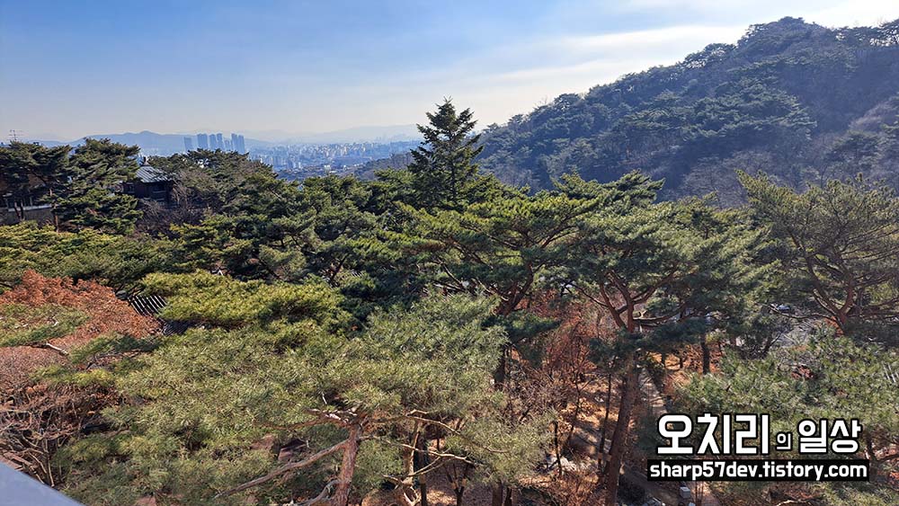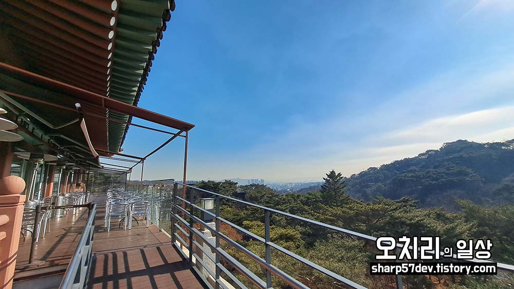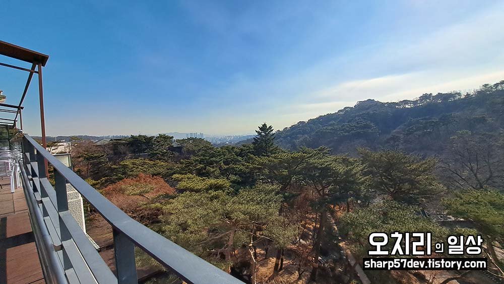 저는 한식당으로 내려가기 전에 잠깐 일화당 테라스에가서 경치구경을 하였습니다. 온통 자연으로 둘러싸여 있으며 파란 하늘이 같이 어울려 멋진 뷰가 감탄하게 만들었습니다. 저 멀리 큰 빌딩들도 보였습니다. 롯데타워도 보였는데 사진 안에는 보이지가 않았네요.