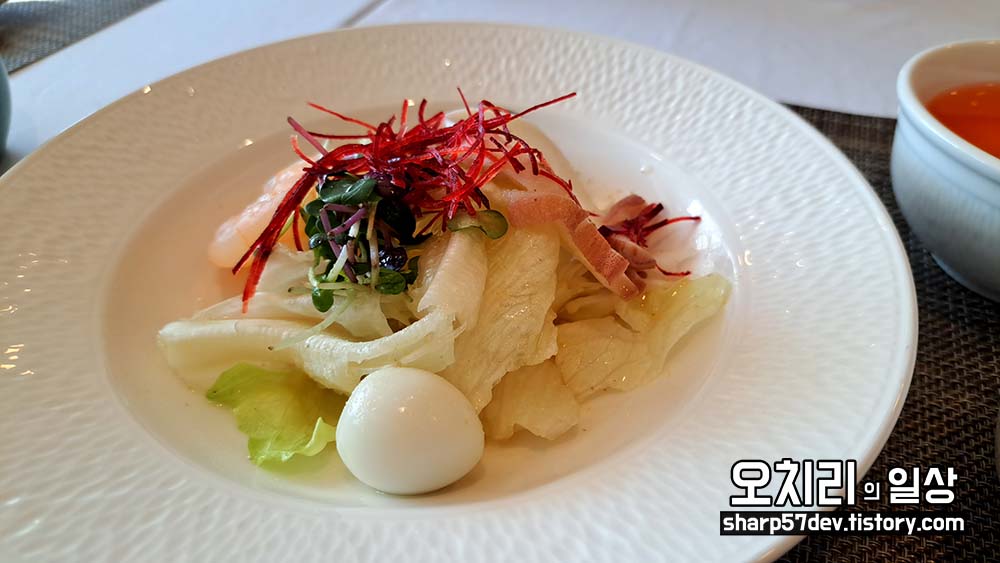 해물 겨자 냉채(문어, 새우)가 나왔습니다. 채소와 어우러진 입안을 상큼하게 만드는 식사 전 입맛을 돋우기에 충분했습니다.