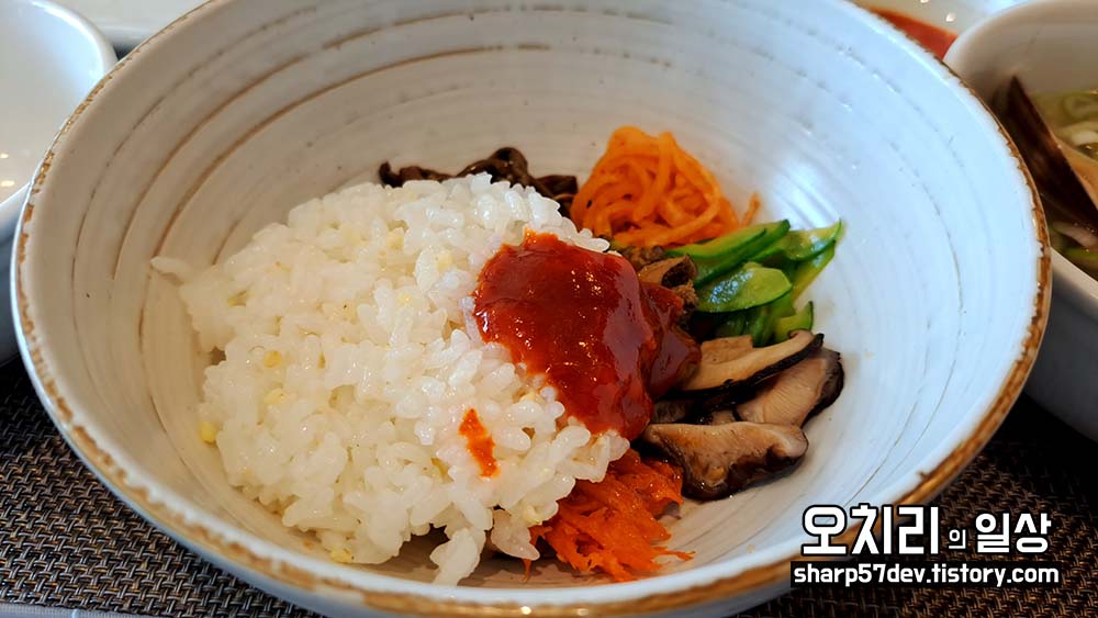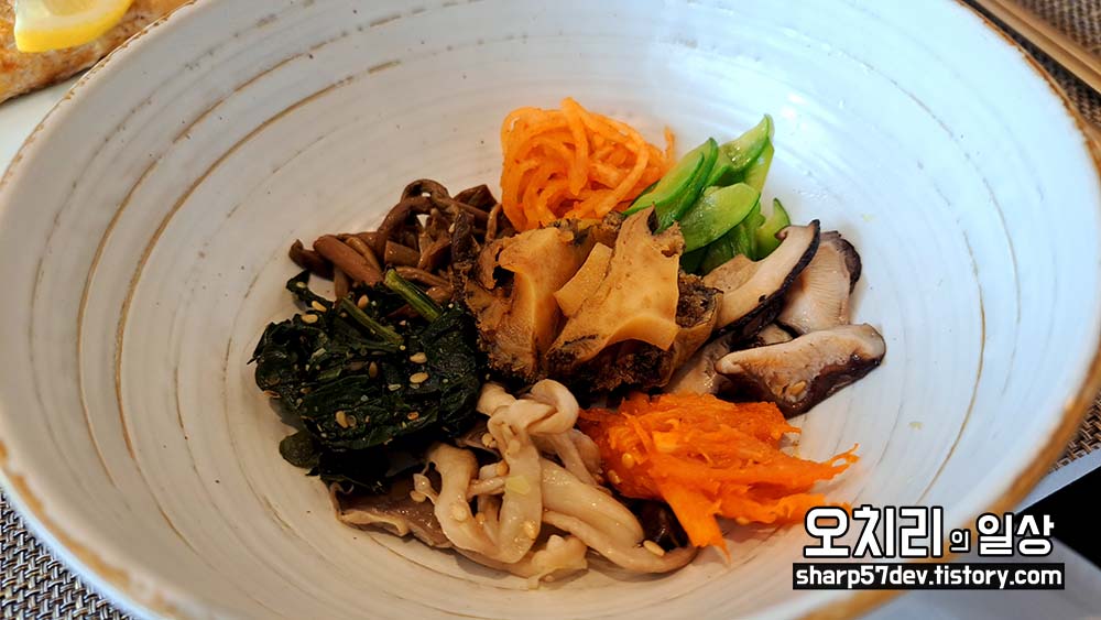 자 이제는 비빔밥을 보겠습니다. 역시나 채소를 잘 안 먹는 저는 버섯, 우엉 등등 머가 들어가 있는지도 잘 모르겠네요.