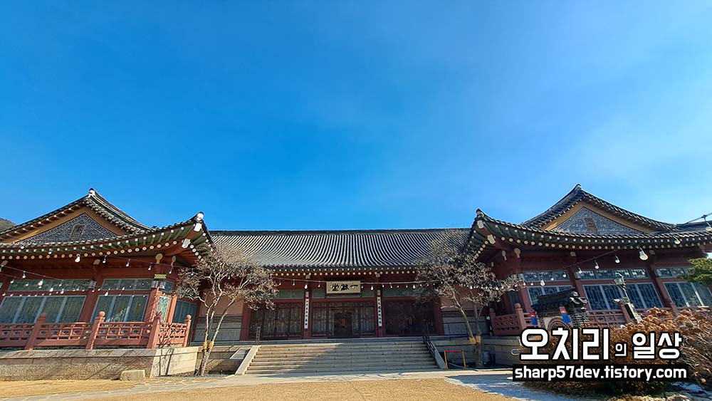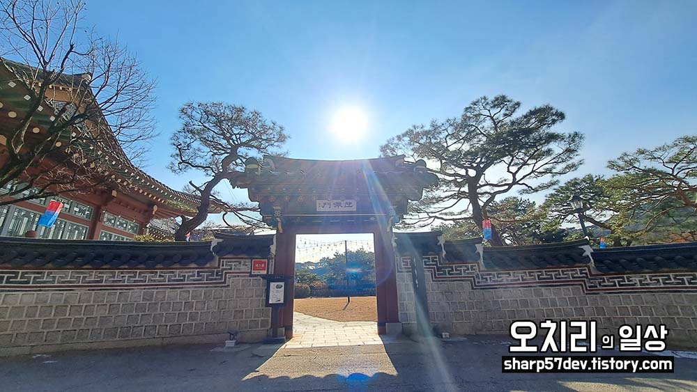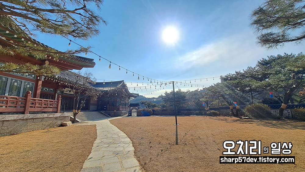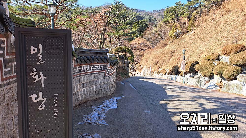 한식당을 찾아 돌길을 걸어가는데 왼쪽에는 일화당이 떡~ 하니 자리잡고 있는 것이 보였습니다. 꽤나 큰 한옥이었으며 마당도 넓고, 그리고 제가 간 이날은 날씨가 너무 좋아서 파란 하늘까지 보여주니 너무나 웅장하고 멋지게 보이는 한옥이었습니다.