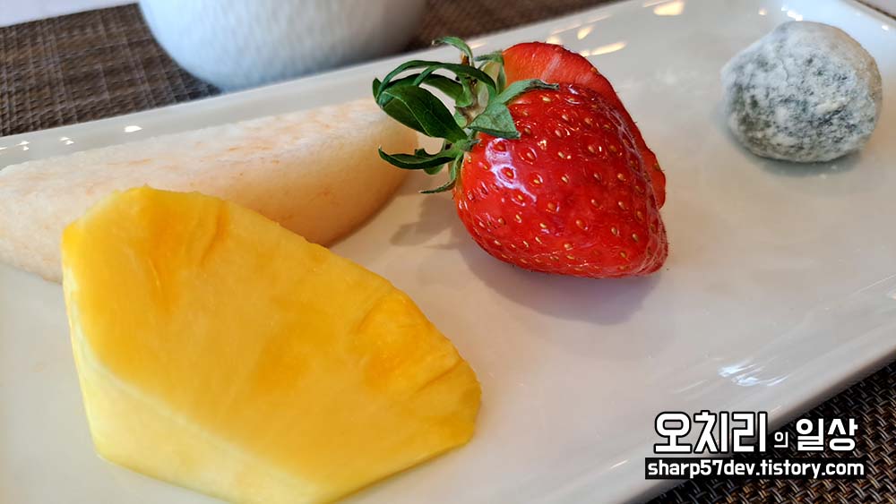 식사를 마치니 주전부리로 배 한 조각, 파일애플 한조각, 딸기 반으로 나눈 것과 인절미(?) 떡이 나왔습니다.