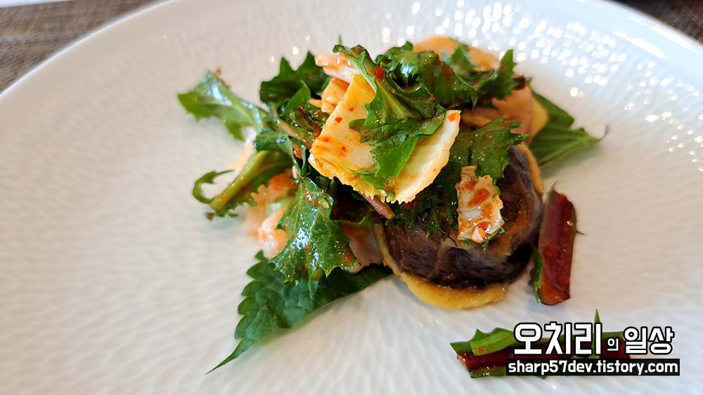 그리고 계절 채소를 얹어서 먹으라고 계절 채소를 얹어 먹었습니다. 정말 기름기 있는 전에 채소를 같이 먹으니 느끼함이 싹 달아났습니다.