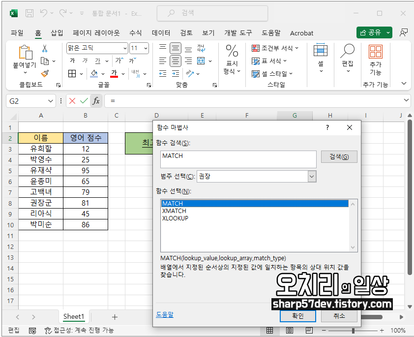 다시 한번 fx버튼을 누릅니다. 이번에는 'MATCH'함수를 검색하고 확인을 눌러 필요한 인자를 넣을 것입니다.