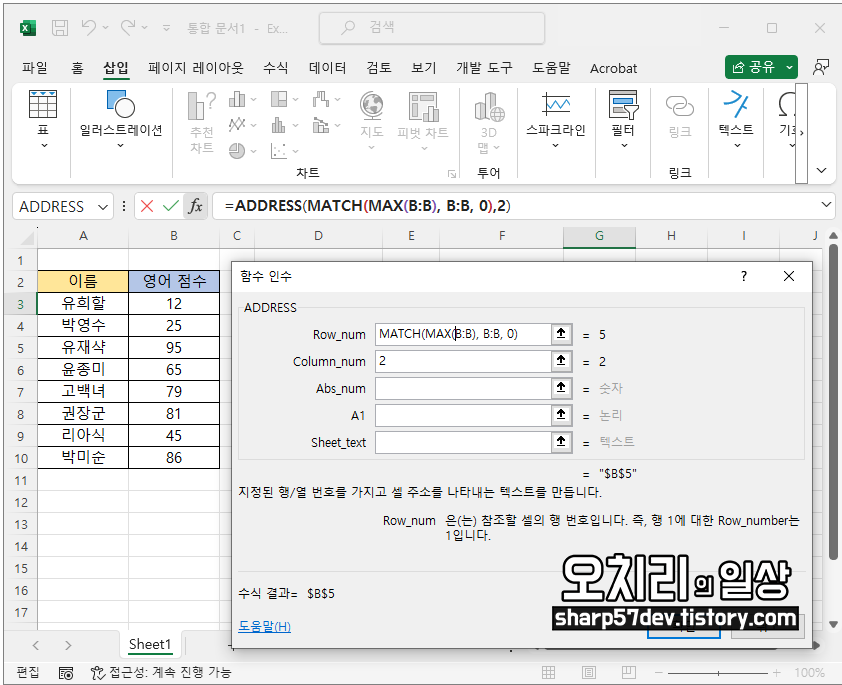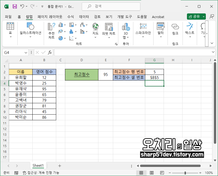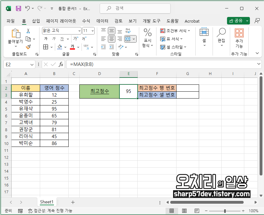 그러므로 최고점수(95)와 값이 일치하는 것은 '수식 결과 = 5'로 엑셀 B열의 5번째 행이 되겠습니다.