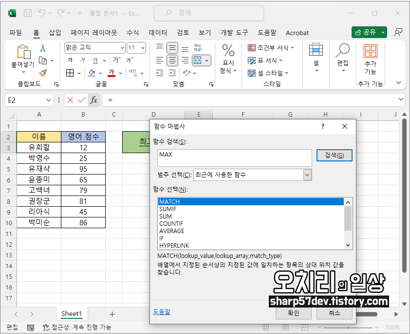 엑셀(excel) 함수로 최고값 구하고 셀 위치 구하는 방법