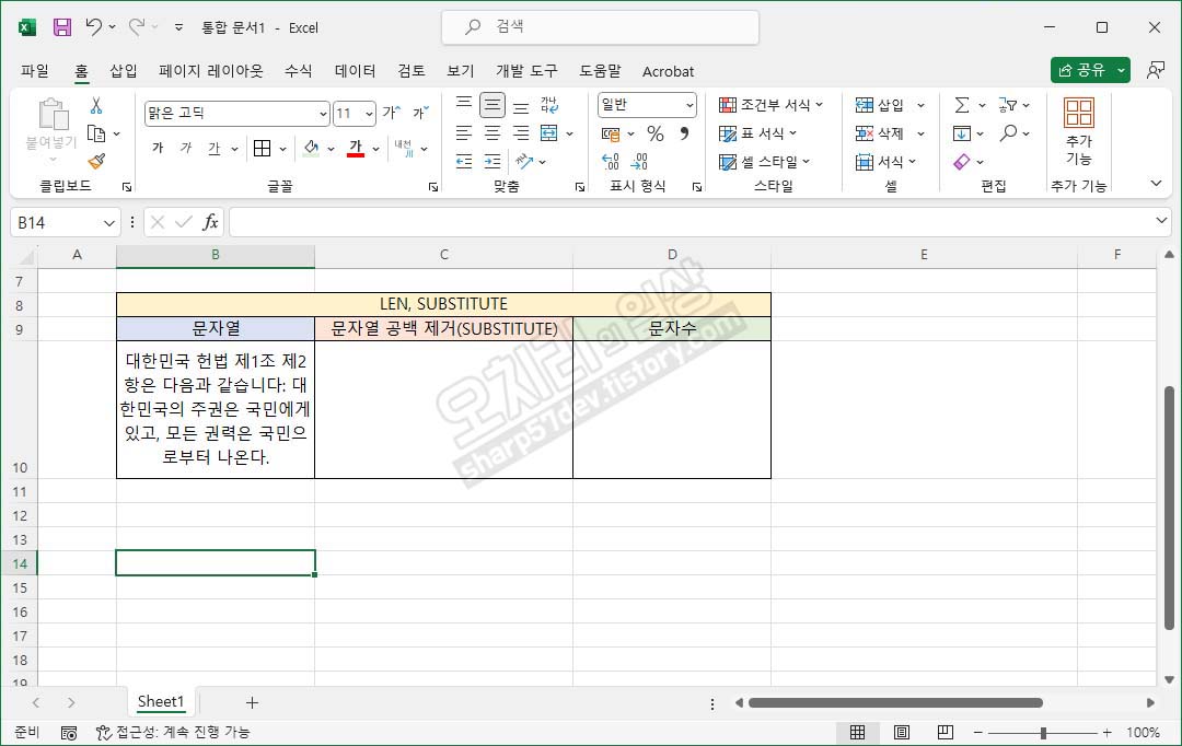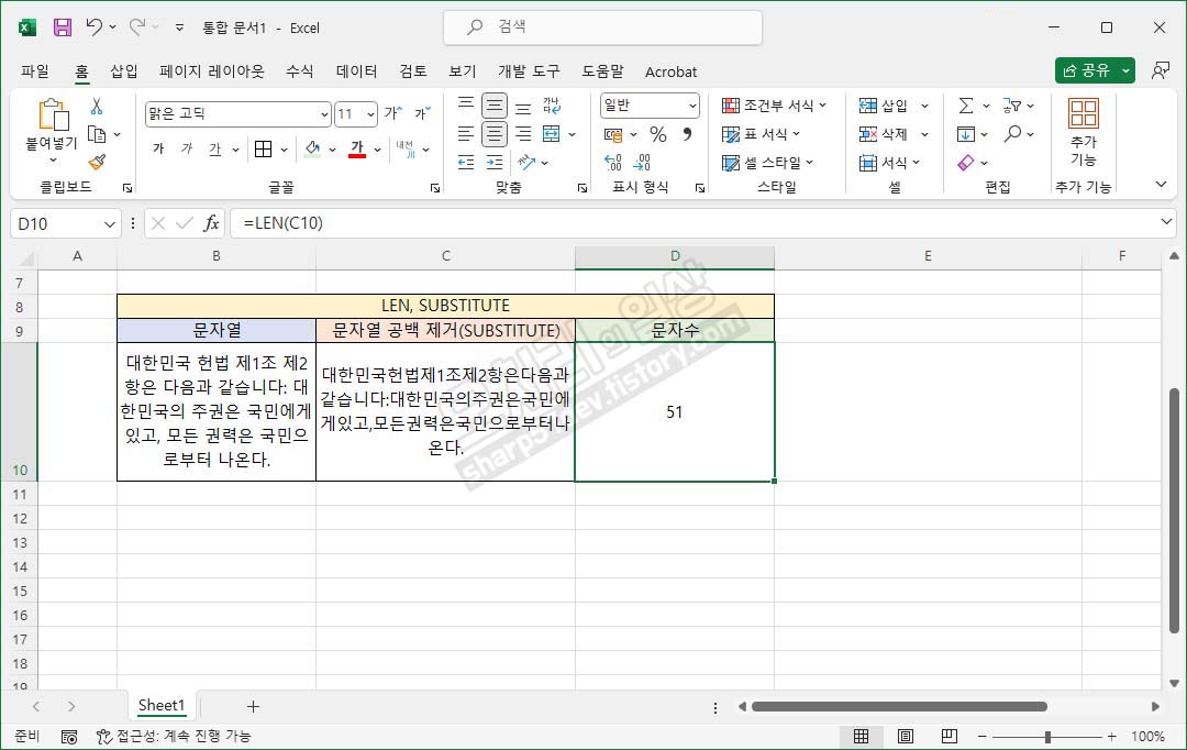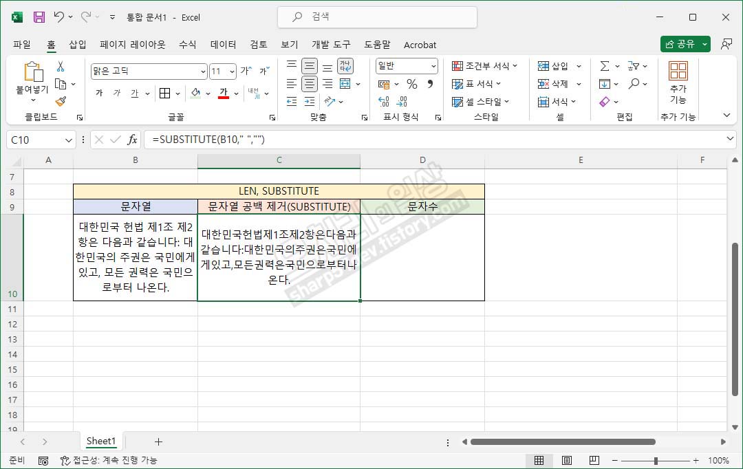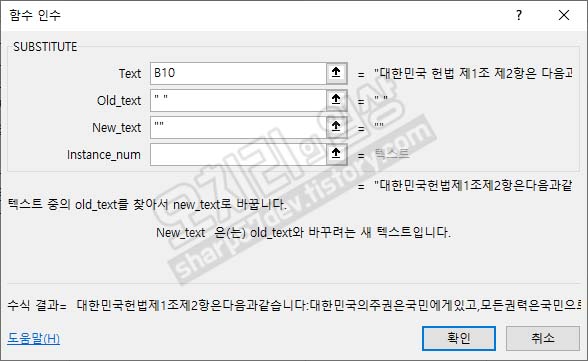 그리고 셀 C10에 출력값은 "대한민국헌법제1조제2항은다음과같습니다:대한민국의주권은국민에게있고,모든권력은국민으로부터나온다."가 되어 빈칸이 한 칸도 없게 적용됩니다.
