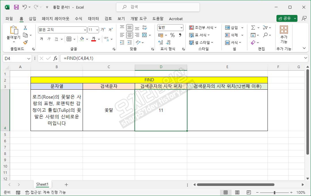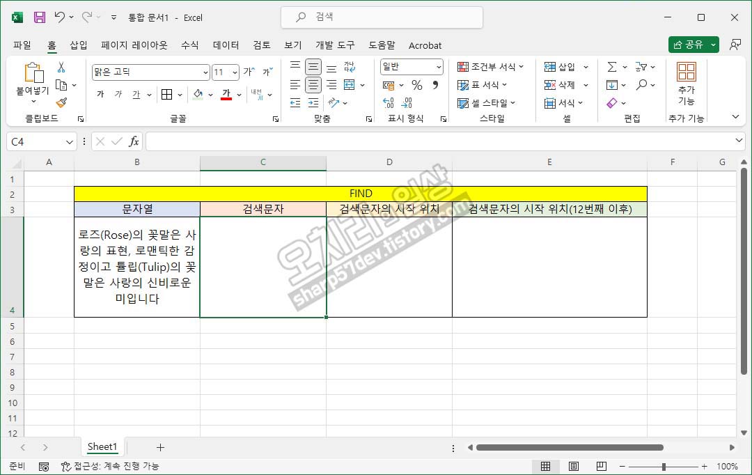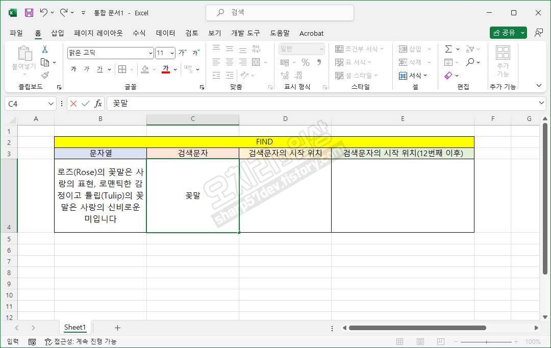 "로즈(Rose)의 꽃말은 사랑의 표현, 로맨틱한 감정이고 튤립(Tulip)의 꽃말은 사랑의 신비로운 미입니다"안에서 검색할 단어를 C4셀에 입력하고, 이 함수를 작성한 D4셀에 검색된 단어의 첫음절이 이 문장에서 몇 번째 음절에 있는지 숫자로 출력하여 알려줍니다.