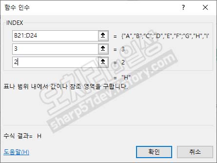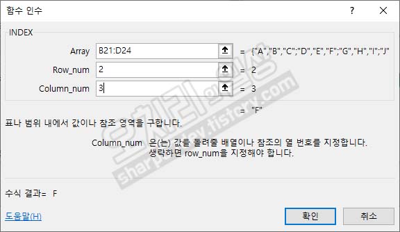 이 함수는 '=INDEX(B21:D24,2,3)'