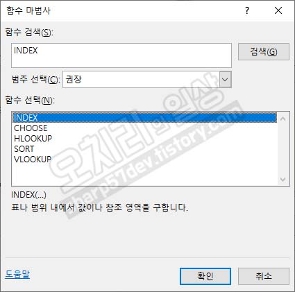 함수 'INDEX'를 검색하고 확인 버튼을 누릅니다.