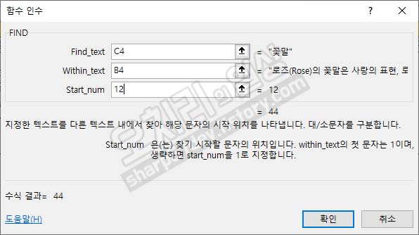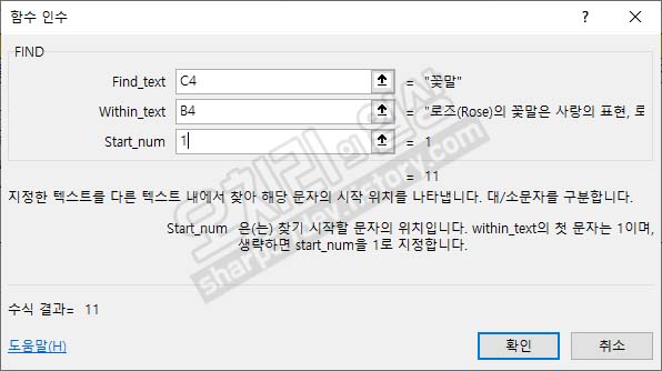 그럼 두 번째 '꽃말'이라는 단어의 순서는 몇 번째에 있는지 알아보고 싶으면 위 이미지와 같이 인수를 입력합니다.