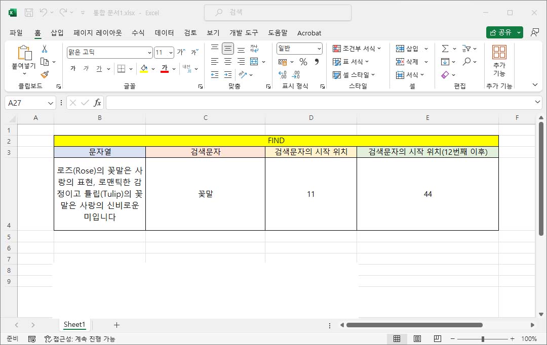 Find_text에 검색할 단어가 있는 셀 C4를 인수로 넣습니다. - 여기서는 "꽃말"을 검색합니다.