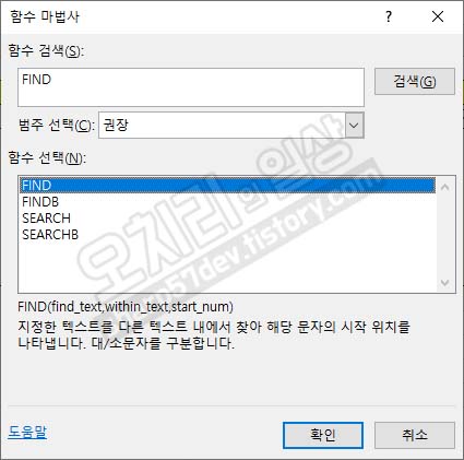 함수 'FIND'를 검색하고 '확인'버튼을 클릭합니다.