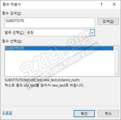 셀 C10의 함수 마법사를 띄우고 함수 'SUBSTITUTE'를 검색하고 선택 후 확인버튼을 클릭합니다.