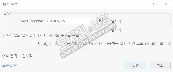 5. '함수 인수'에는 이번에는 '5'일 전으로 가기 위해 'TODAY() - 5'를 인수에 입력하고 확인버튼을 클릭합니다.