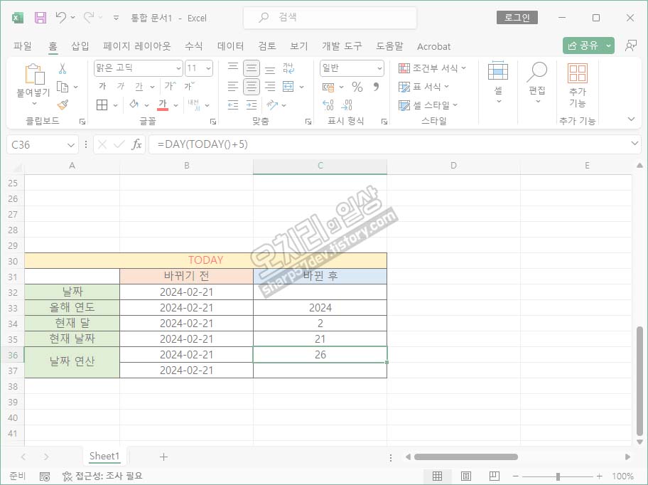 3. 위 연산 후 'DAY'인 '21'일에서 '5'일 후인 '26'일이 'C36'에 출력되었음을 확인 가능합니다.
