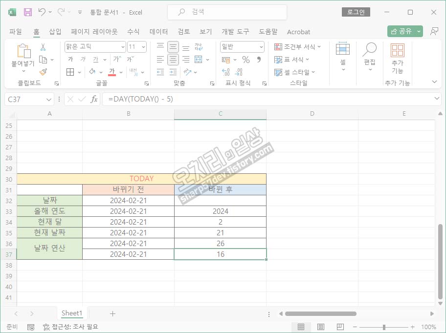 셀 'C37'의 함수식은 =DAY(TODAY()-5)가 되겠습니다.