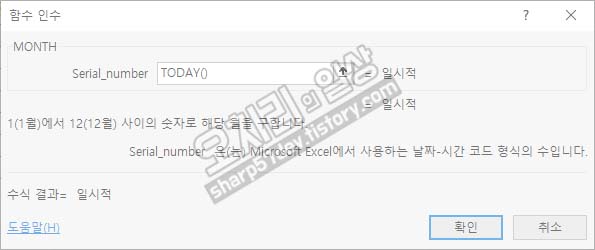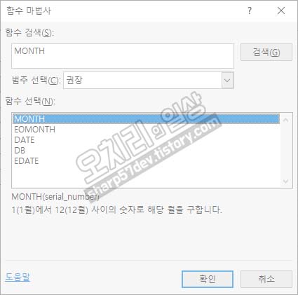 그리고 '함수 마법사'창을 출력합니다. 'MONTH'함수를 검색하고 선택 후 확인 버튼을 클릭합니다.