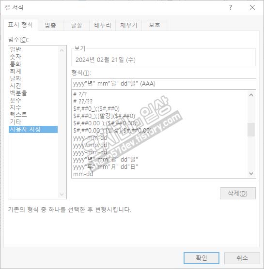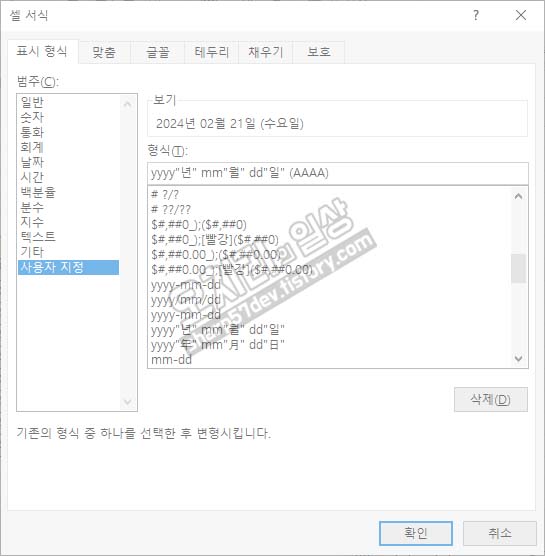 '범주'에서 '사용자 지정'으로 선택하고 날짜 형식을 정합니다.