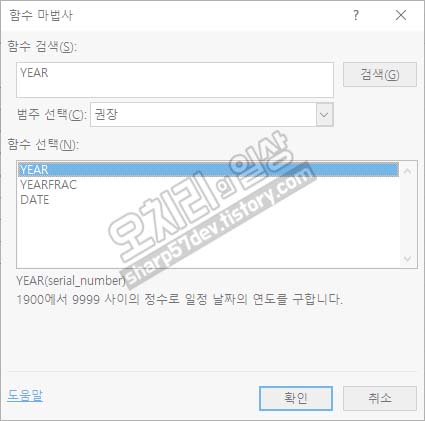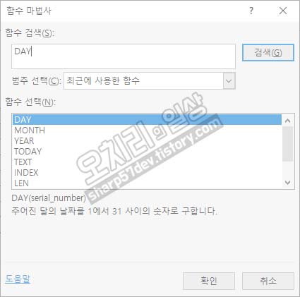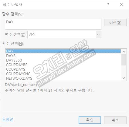 함수 'DAY'를 검색하여 선택 확인버튼을 클릭합니다.