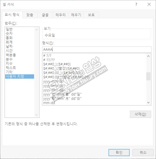 위 이미지처럼 형식을 'yyyy"년" mm"월" dd"일" (aaaa)'이렇게 설정합니다.