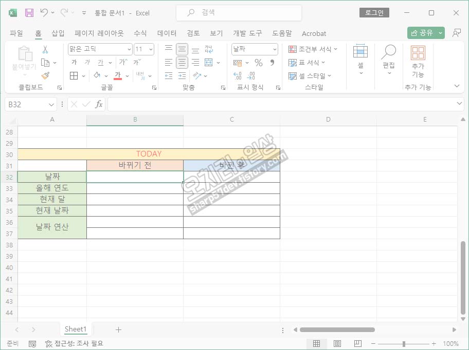 일단 'B32'~'B37'까지 'TODAY'함수를 이용해 현재 날짜를 구해 출력해 놓습니다.