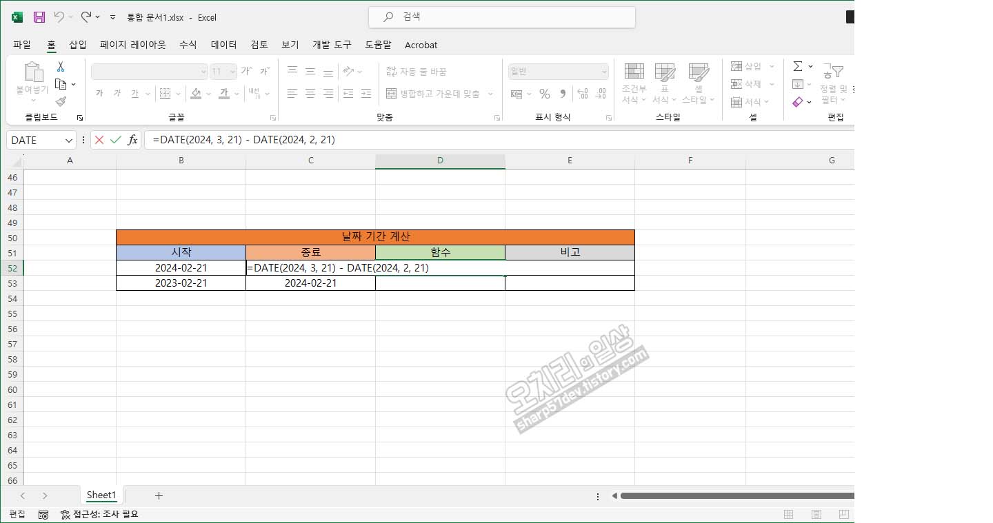 셀 'D53'에 '=DATE(2024, 2, 21) - DATE(2024, 2, 21)'을 코딩해보았습니다.