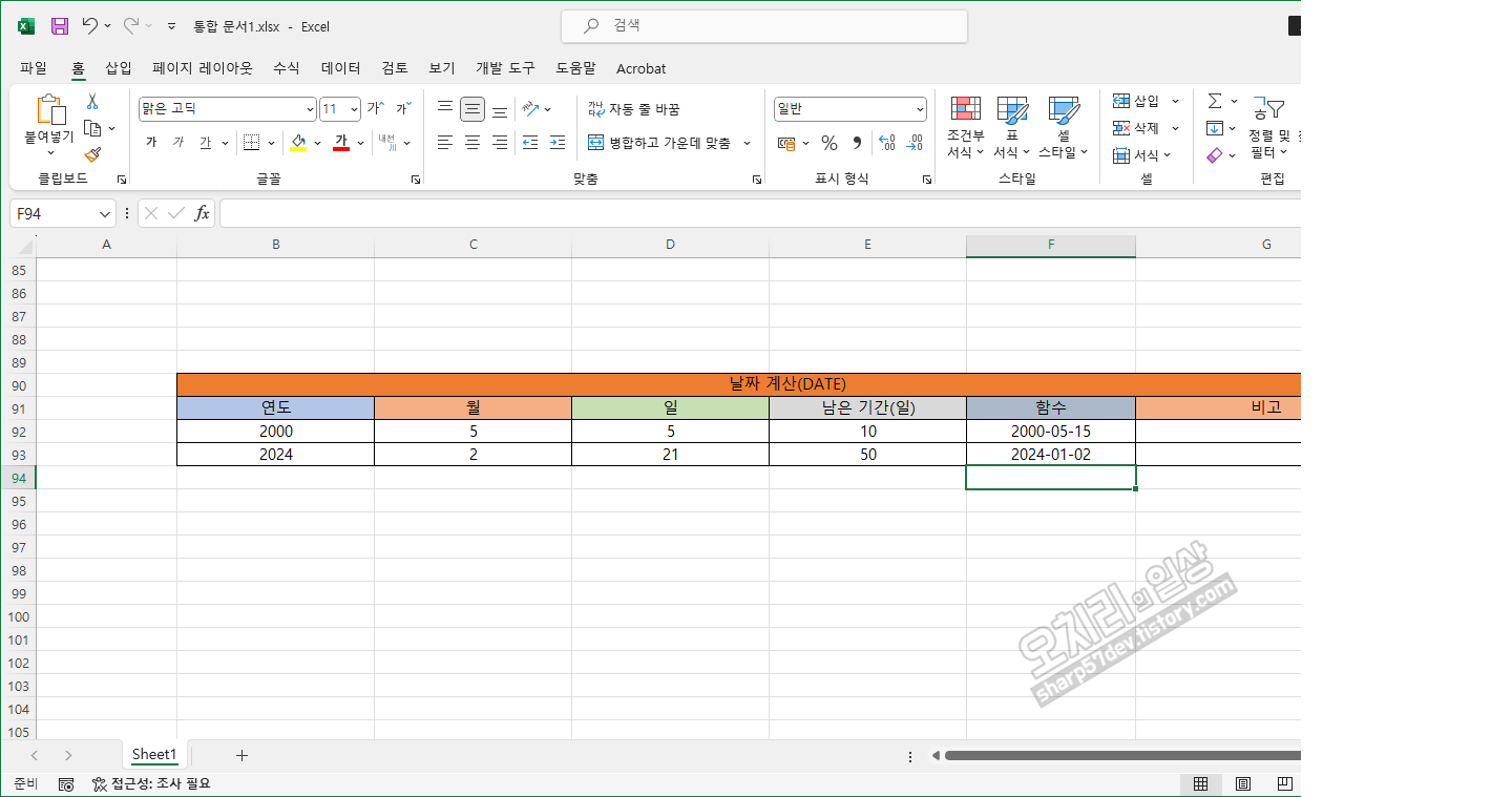 셀 'F93'에 마우스를 클릭하여 포커스를 주고 '=DATE(B93, C93, D93) - E93'으로 셀 위치값으로 인수를 대입하여 계산하여 계산하였습니다.