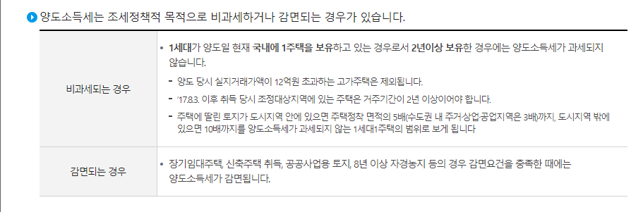 - 예를 들어 주택의 자가거주를 위한 주택을 처분할 때는 일정한 조건을 충족하면 양도소득세가 면제될 수 있습니다. 또한, 주식의 경우 장기 보유자산인 경우에는 일정한 조건을 충족하면 양도소득세가 면제될 수 있습니다. - 면세대상: - 일부 자산은 특정 조건을 충족할 경우 양도소득세의 면제 대상이 될 수 있습니다. 이러한 면세 대상은 세법이나 관련 규정에 따라 정해지며, 주택 매매나 장기 보유 주식 등이 해당됩니다.