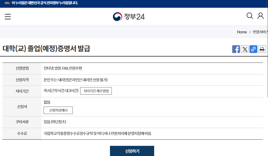 - 위와 같은 방법으로 정부24 홈페이지를 통해 대학 졸업 증명서를 발급 받을 수 있습니다.
